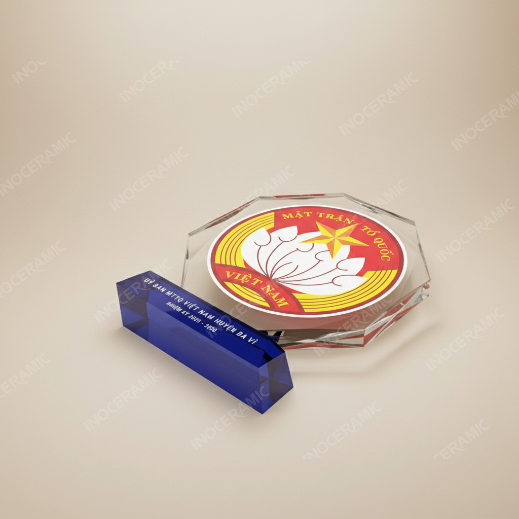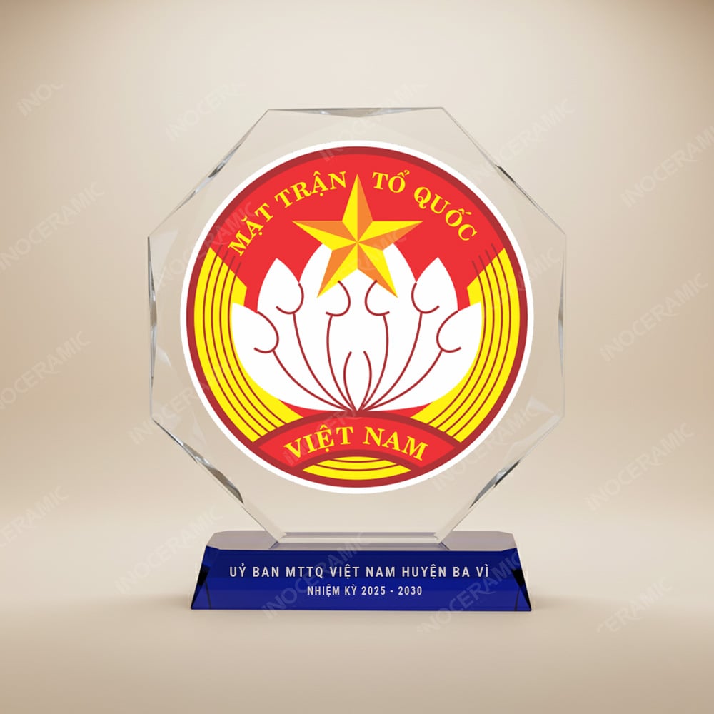 Kỷ niệm chương pha lê in logo Đại hội Mặt trận Tổ quốc Việt Nam là món quà trang trọng và đầy ý nghĩa. Thiết kế tinh xảo, đường nét sắc nét trên chất liệu pha lê trong suốt tượng trưng cho sự minh bạch, đoàn kết và tỏa sáng của khối đại đoàn kết toàn dân tộc.
