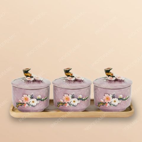 Bộ 3 hũ mứt hoa đào đắp nổi gốm sứ Bát Tràng là một trong những mẫu quà Tết cao cấp gây ấn tượng mạnh nhờ thiết kế thủ công tinh xảo, giàu thẩm mỹ và mang ý nghĩa may mắn đầu xuân. Từng chi tiết hoa đào được đắp nổi thủ công trên nền gốm tím pastel lạ mắt, tạo độ nổi 3D sống động và sang trọng. Kiểu dáng hũ tròn kết hợp nắp đậy tạo hình chim én – biểu tượng của mùa xuân – giúp bộ sản phẩm trở thành món quà Tết doanh nghiệp, set quà Tết cao cấp hoặc quà Tết in logo vô cùng ý nghĩa dành cho khách hàng, đối tác, tổ chức và B2B.