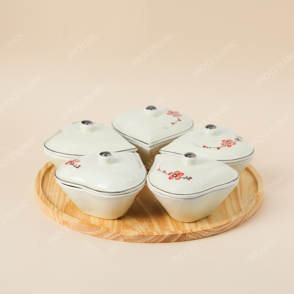 Bộ sản phẩm gồm 05 hũ đựng mứt dáng trái tim, được sắp xếp trên khay gỗ tròn chắc chắn, tạo nên bố cục cân đối và thẩm mỹ cao. Họa tiết hoa đào đỏ được nghệ nhân Bát Tràng vẽ tay hoàn toàn, từng cánh hoa mềm mại, sắc đỏ nổi bật trên nền men trắng ngà tạo cảm giác hài hòa và rực rỡ trong không gian ngày Tết. Mỗi sản phẩm là một tác phẩm thủ công độc bản, mang nét đẹp tinh xảo mà không dòng sản phẩm công nghiệp nào có thể thay thế.