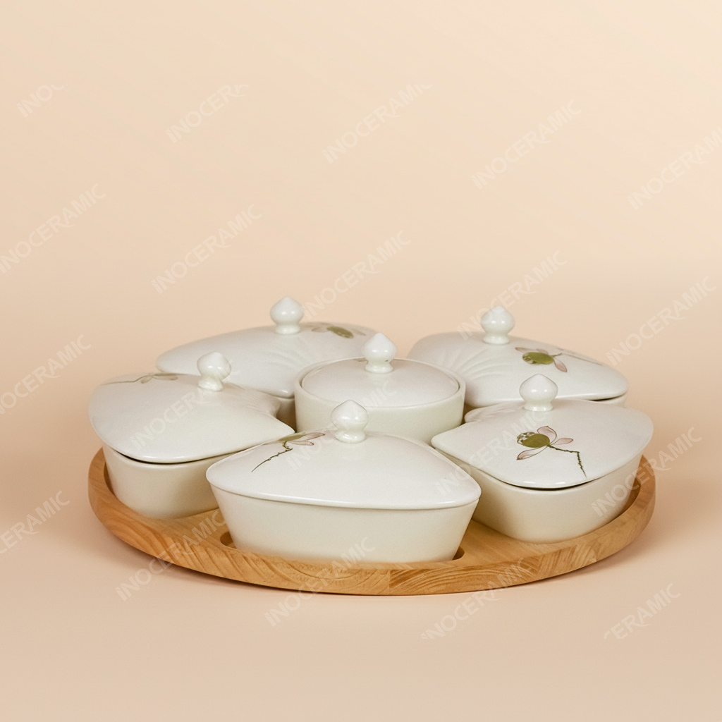 Họa tiết sen vẽ tay được thực hiện bằng kỹ thuật thủ công của nghệ nhân Bát Tràng, phối màu nhẹ nhàng, tinh khiết, tạo cảm giác thanh tao và hiện đại. Bộ hũ đặt trên khay gỗ tròn chắc chắn, vừa tăng tính thẩm mỹ vừa giúp sản phẩm trở thành khay đựng bánh kẹo, hũ đựng bánh kẹo, hũ đựng hạt tiện dụng trong ngày Tết.