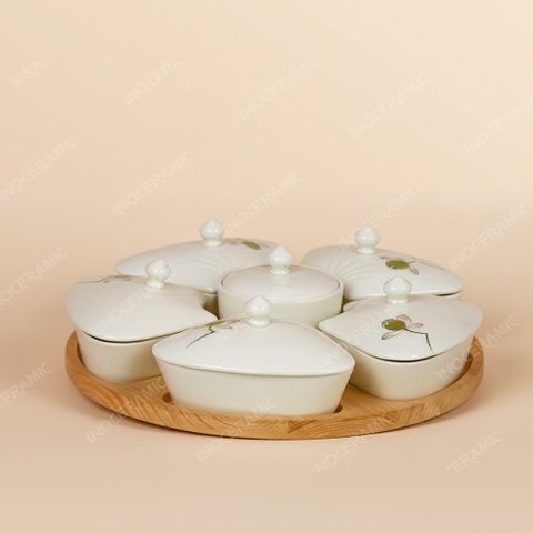 - Thành phần bộ: 06 hũ mứt + 01 khay gỗ