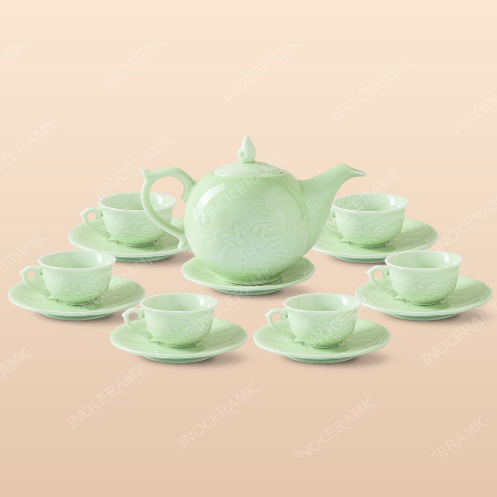 Bộ ấm chén trà mẫu đơn men ngọc khắc sen - Quà tặng in logo