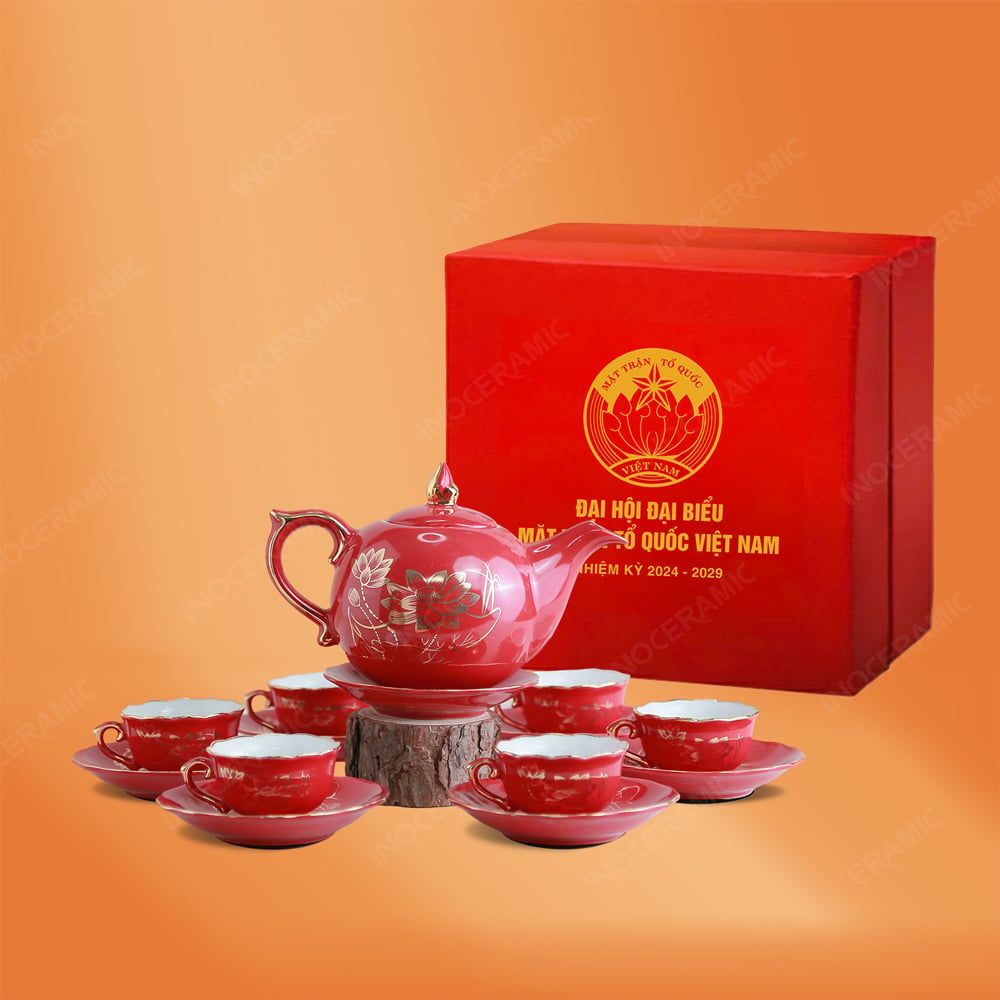 Bộ ấm trà Mẫu Đơn men đỏ sen vàng vẽ vàng mang sắc đỏ may mắn, điểm xuyết họa tiết sen vàng tinh tế, biểu trưng cho phú quý, thịnh vượng và đoàn kết. Thiết kế sang trọng, men sứ bóng mịn, đường nét vẽ tay tỉ mỉ – lựa chọn hoàn hảo làm quà tặng Đại hội Mặt trận Tổ quốc Việt Nam, vừa ý nghĩa vừa trang nhã.