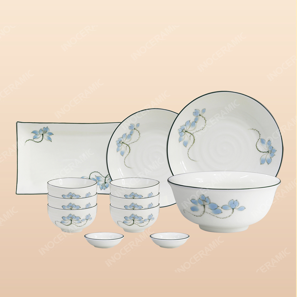 Bộ bát đĩa 12 món men sứ Sen Xanh gồm bát cơm, đĩa lớn, đĩa nhỏ, tô và chén nước chấm – đủ dùng cho bữa cơm gia đình ấm cúng hay những buổi tiệc sang trọng.