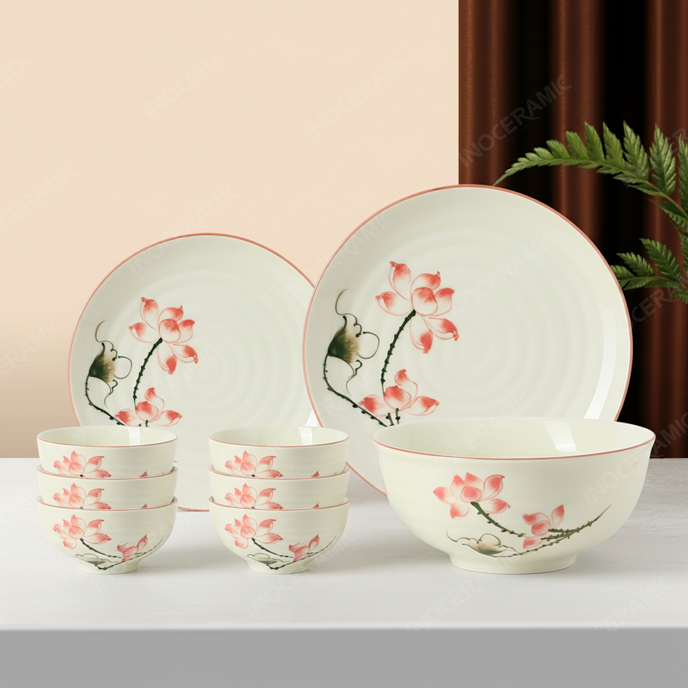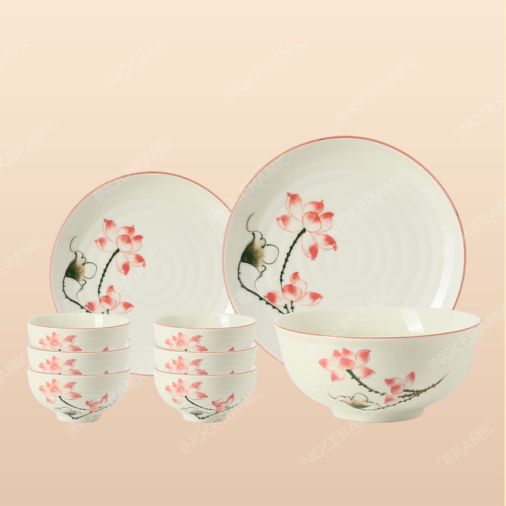 Bộ bát đĩa 9 món men sứ Sen Hồng bao gồm bát cơm, đĩa lớn, đĩa nhỏ, tô và chén nước chấm – đáp ứng trọn vẹn nhu cầu sử dụng trong mọi bữa ăn.