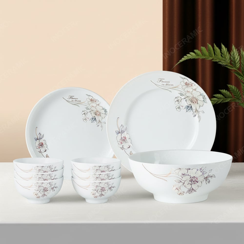 Bộ bát đĩa 9 món men sứ Sơn Trà gây ấn tượng bởi tông men trắng ngà nhẹ nhàng, toát lên vẻ thanh khiết và trang nhã. Mỗi chi tiết hoa Sơn Trà được khắc họa uyển chuyển, tượng trưng cho niềm vui và hạnh phúc, phù hợp với tinh thần đoàn viên.