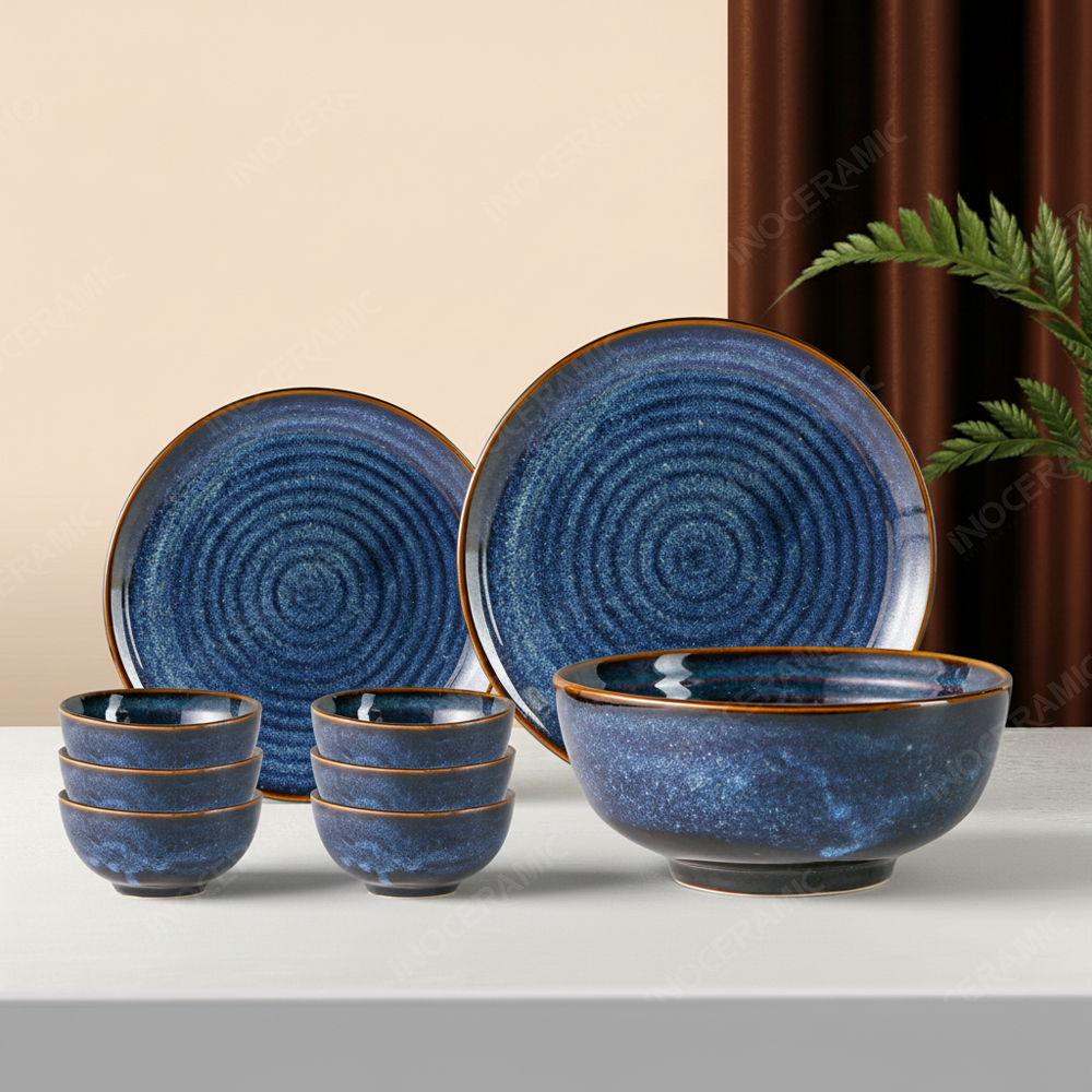 Bộ bát đĩa 9 món men xanh hỏa biến sở hữu sắc xanh lam đậm biến đổi linh hoạt theo ánh sáng, tạo hiệu ứng thị giác độc đáo và sang trọng.