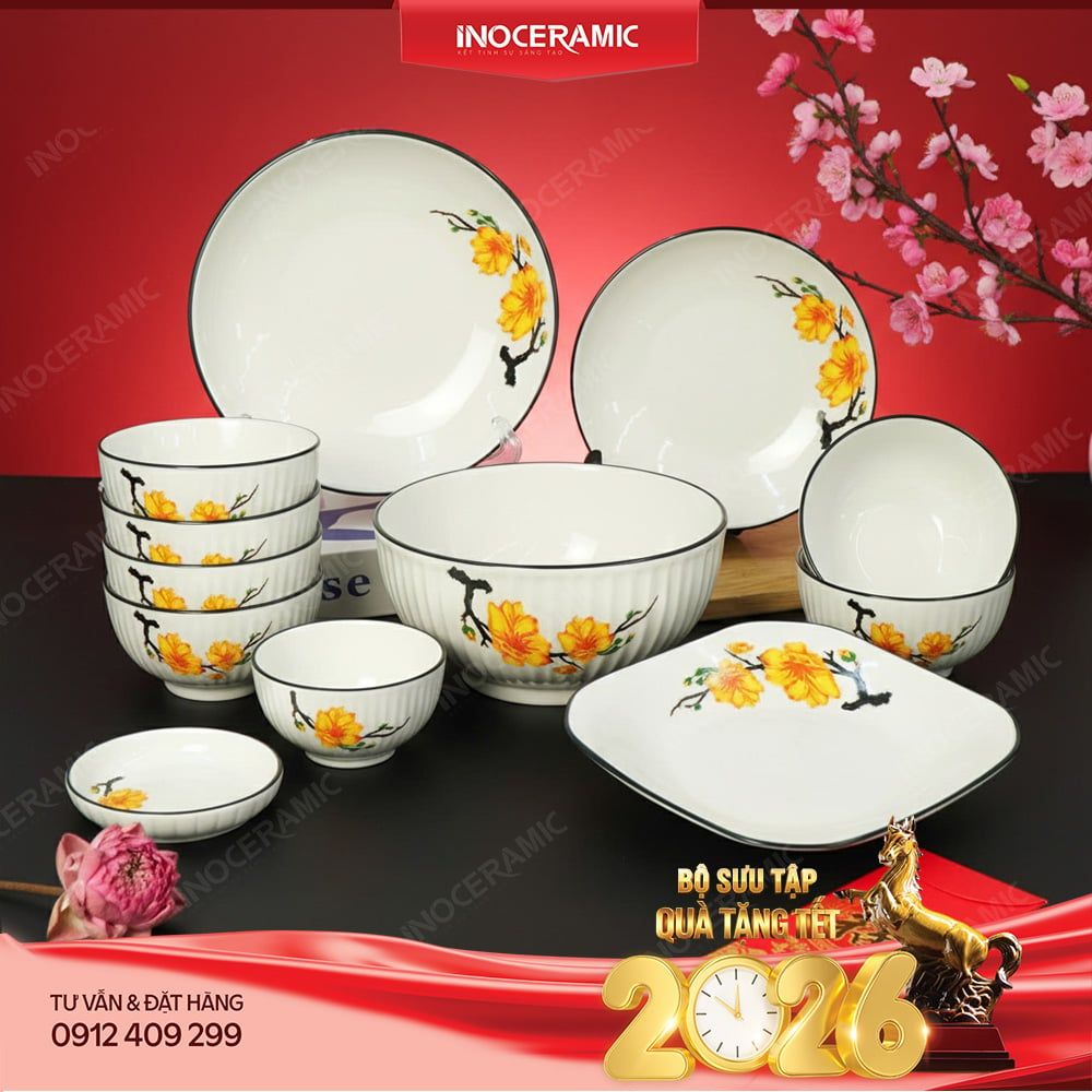 🎁 Bộ bát đĩa Hoa Mai gồm 12 sản phẩm gốm sứ cao cấp – Quà Tết thiết thực và ý nghĩa, gửi trọn tinh hoa sum vầy