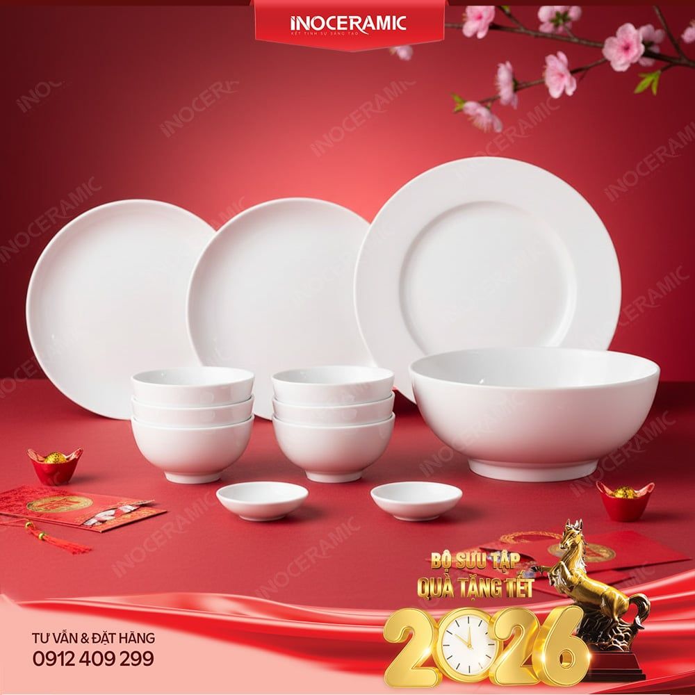 Nhờ vậy, mỗi bộ bát đĩa men trắng 12 sản phẩm trở thành set quà Tết doanh nghiệp hoàn hảo – vừa tri ân, vừa truyền thông thương hiệu tinh tế.