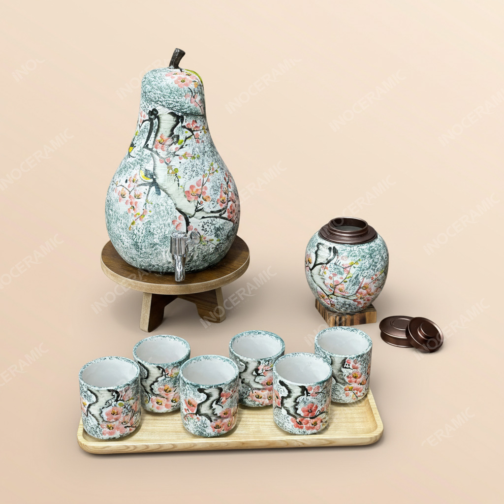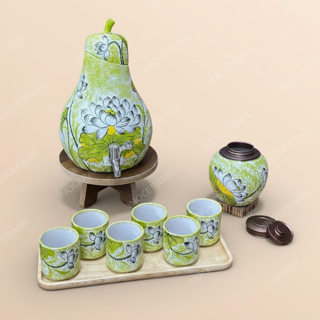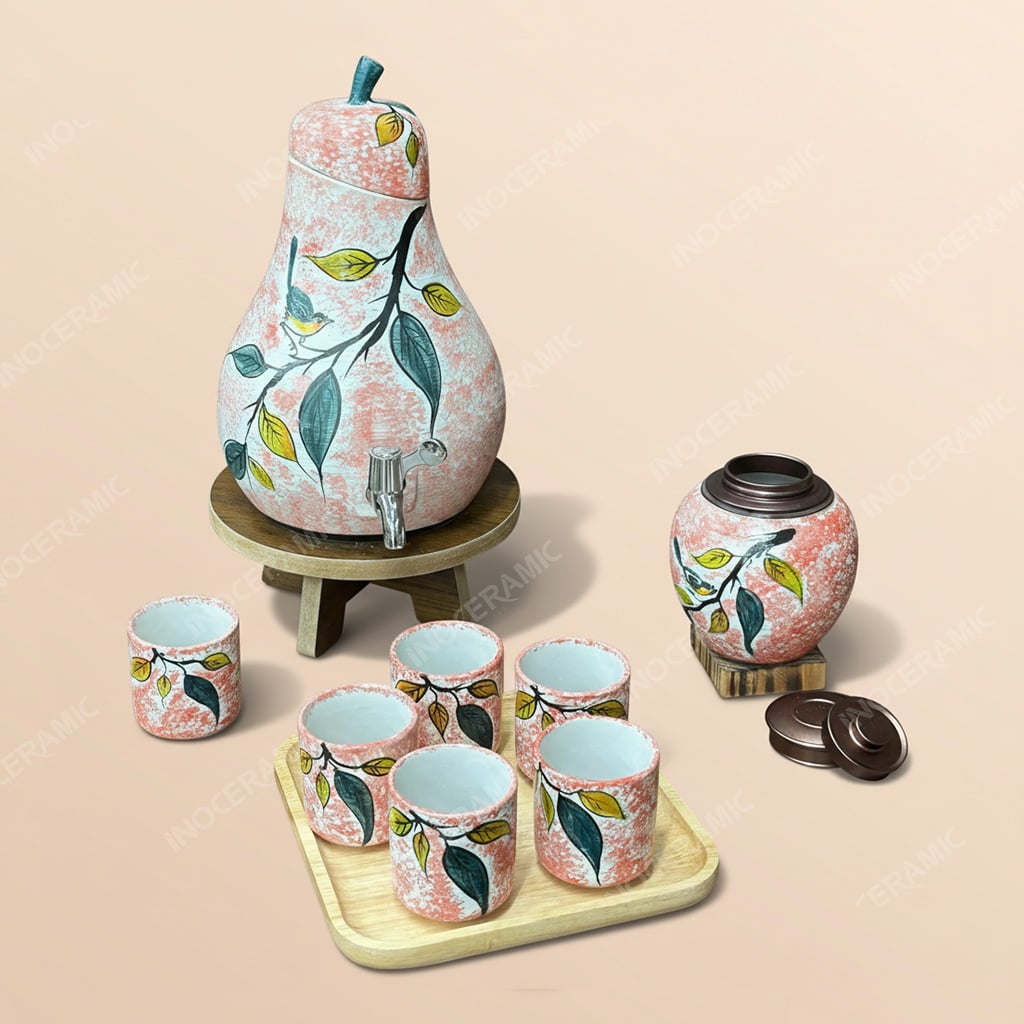 Bộ sản phẩm bao gồm 01 bình đựng nước sứ dáng quả lê với dung tích linh hoạt theo nhu cầu sử dụng, được trang bị vòi xả inox cao cấp chống gỉ giúp rót nước dễ dàng và sạch sẽ. Đi kèm là 06 cốc sứ đồng bộ hoa văn, 01 hũ đựng trà nắp kín giữ trọn hương vị và kệ gỗ để bàn chắc chắn, tạo tổng thể gọn gàng, tinh tế. Sự kết hợp hài hòa giữa gốm sứ và gỗ tự nhiên mang lại cảm giác ấm áp, cao cấp, phù hợp đặt tại phòng khách, văn phòng, phòng họp hoặc khu vực tiếp khách.
