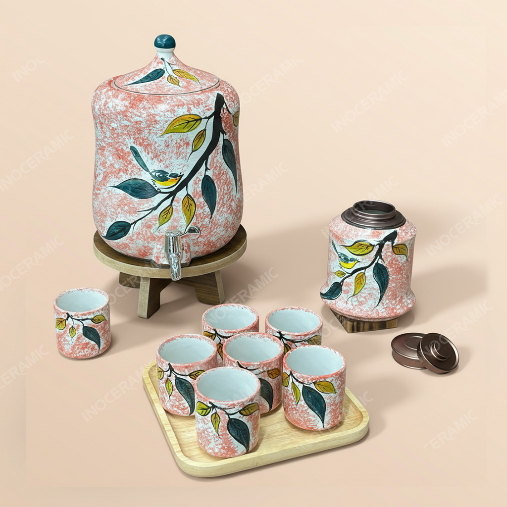 Bộ sản phẩm được chế tác từ nguồn đất sét chọn lọc, nung ở nhiệt độ cao theo quy trình chuẩn của xưởng sản xuất gốm sứ Bát Tràng, giúp xương gốm chắc khỏe, bền màu và an toàn cho sức khỏe người dùng. Bình đựng nước có kiểu dáng bo tròn hiện đại, dung tích linh hoạt theo nhu cầu sử dụng, kết hợp vòi xả inox cao cấp chống gỉ, đảm bảo tiện lợi khi rót nước, trà hay các loại đồ uống khác. Đi kèm là 06 cốc sứ đồng bộ và 01 hũ đựng trà có nắp kín, tất cả được đặt gọn gàng trên kệ gỗ để bàn, tạo nên tổng thể hài hòa, sang trọng.