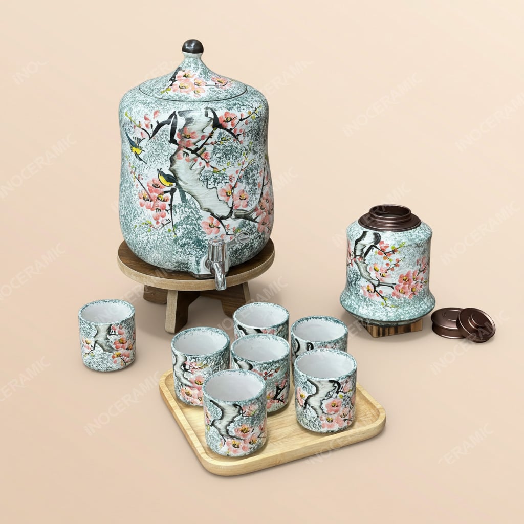 1. Giới thiệu bộ bình sứ đựng nước có vòi xả kèm cốc, hũ trà vẽ tay và kệ gỗ sang trọng