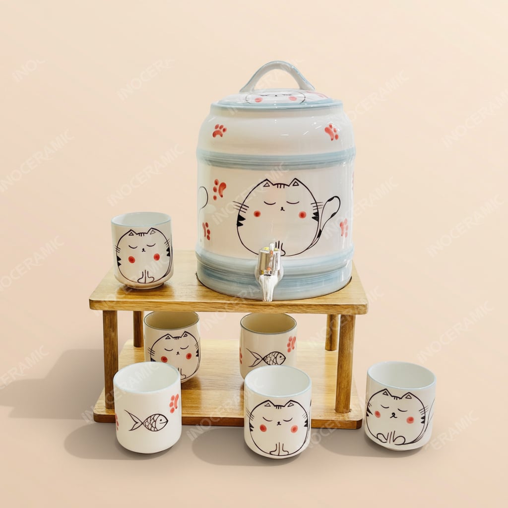 🍶 Bộ bình sứ đựng nước vòi xả Mèo Bông vẽ tay – Nét duyên gốm Việt cho không gian hiện đại