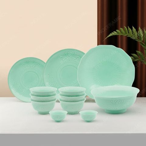 Bộ bát đĩa 12 món men ngọc kẻ vàng lấy cảm hứng từ sắc ngọc bích thanh khiết, biểu tượng cho sự bình an, tài lộc và may mắn trong phong thủy Á Đông.