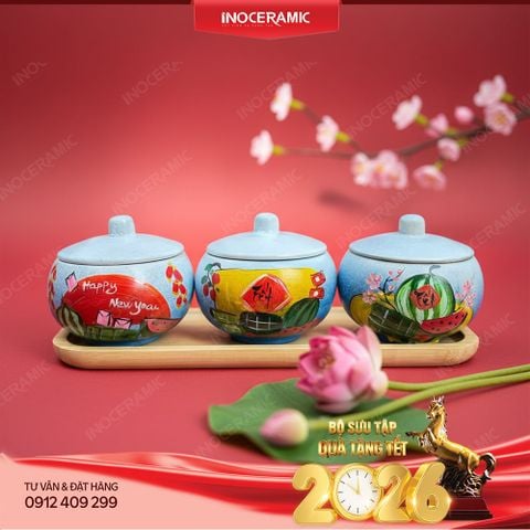 Bộ sản phẩm thường gồm 3 hũ gốm đồng bộ, đặt trên khay gỗ trang nhã, phù hợp đựng mứt Tết, hạt khô, bánh kẹo hoặc ô mai. Đây là dòng khay mứt – hũ đựng bánh kẹo vừa có giá trị sử dụng lâu dài, vừa có tính trưng bày cao trong không gian phòng khách ngày xuân.
