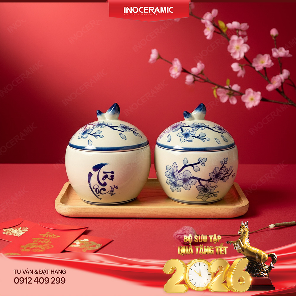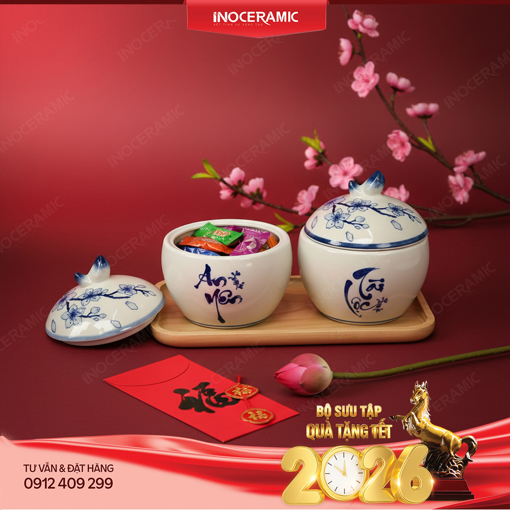 Bộ khay hũ đựng mứt gốm sứ Bát Tràng họa tiết hoa đào xanh cobalt kết hợp thư pháp Việt là một trong những mẫu quà Tết mang tính nghệ thuật đặc sắc nhất. Trên nền sứ trắng ngà sang trọng, các nghệ nhân Bát Tràng đã vẽ tay từng cánh đào bằng men cobalt xanh trầm ấm, hài hòa và giàu chiều sâu mỹ thuật. Đặc biệt, mỗi hũ được trang trí bằng một chữ thư pháp: Sum Vầy – Tài Lộc – An Yên – Phúc Đức, chứa đựng trọn vẹn thông điệp may mắn, đoàn viên và thịnh vượng của Tết Việt.