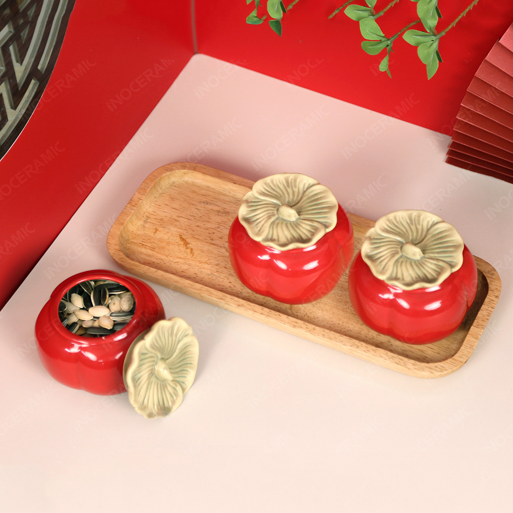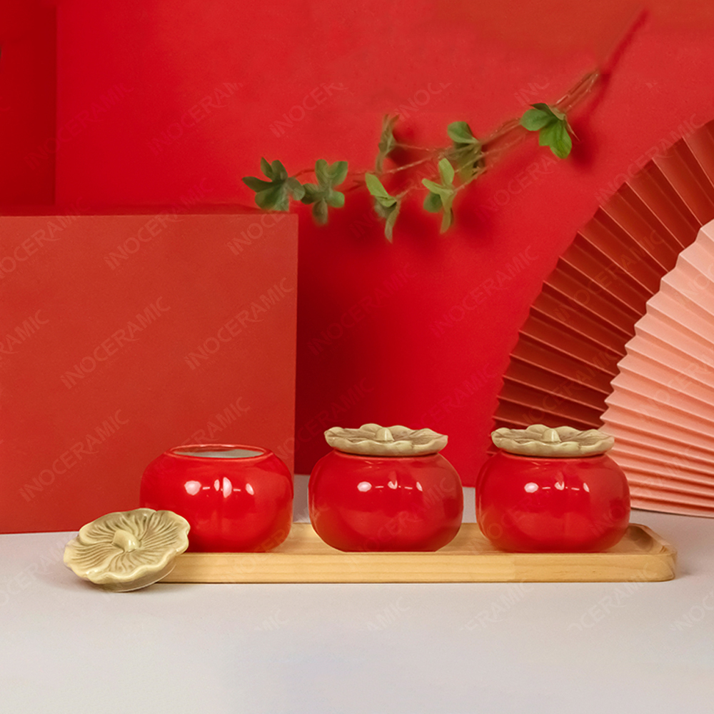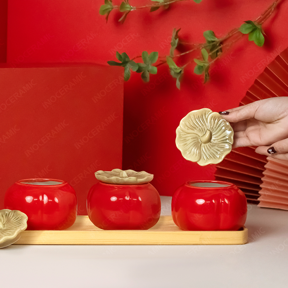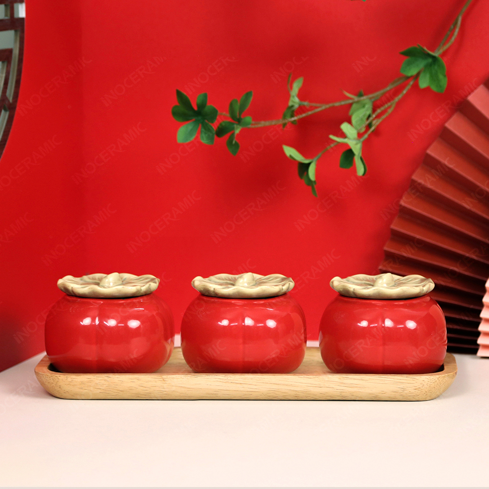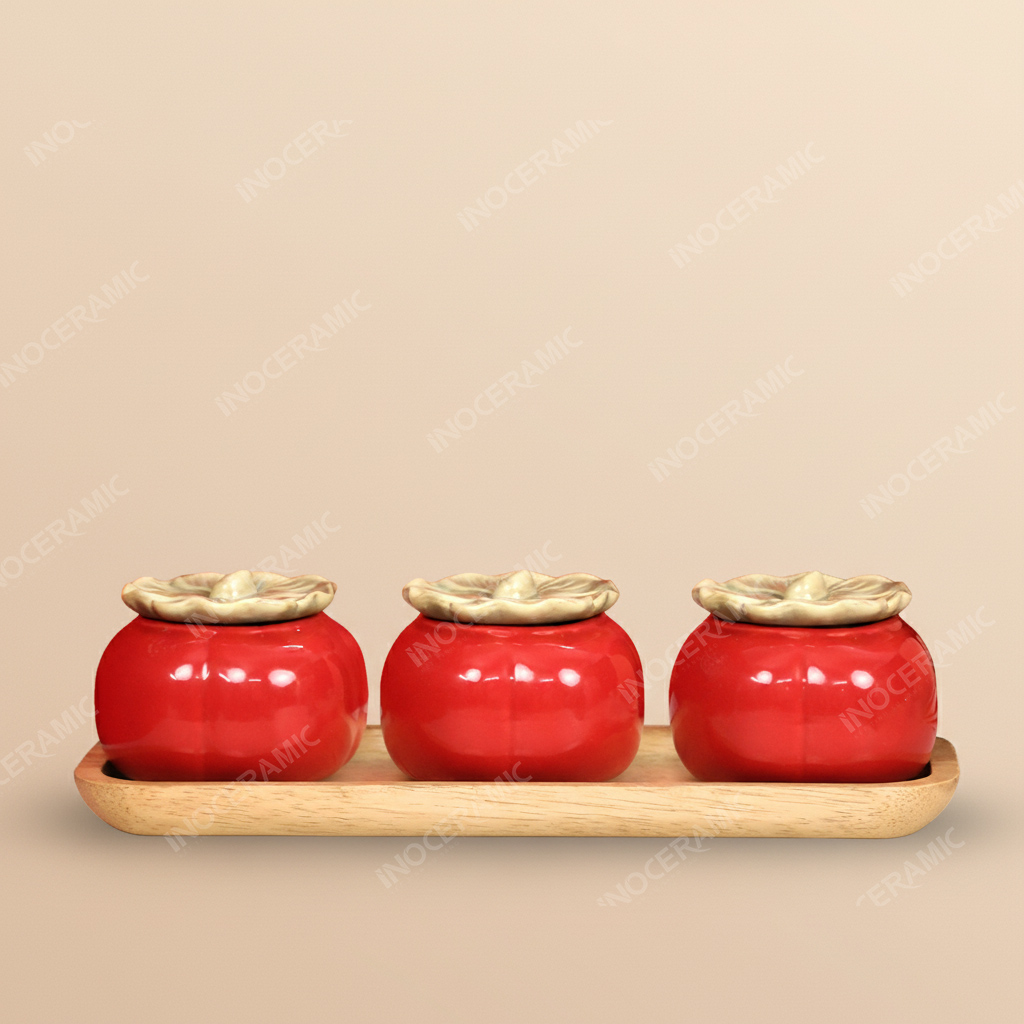 Mỗi hũ được tạo hình chuẩn dáng quả hồng, thân tròn đầy đặn, phần nắp mô phỏng cuống tự nhiên và được phủ lớp men đỏ bóng nổi bật – màu sắc tượng trưng cho hỷ sự, tài lộc và phúc khí. Kết hợp với khay gỗ tự nhiên được bo tròn mềm mại, bộ sản phẩm mang đậm nét sang trọng và rất phù hợp cho các chương trình set quà Tết doanh nghiệp.