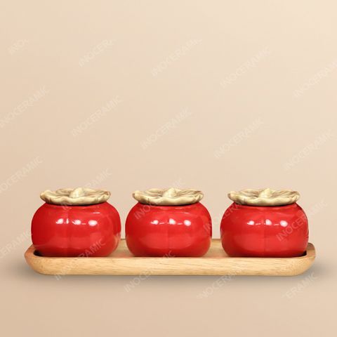 🎁 Khay 3 hũ đựng mứt quả hồng men đỏ – Gốm sứ Bát Tràng cao cấp, quà tết sang trọng và ý nghĩa