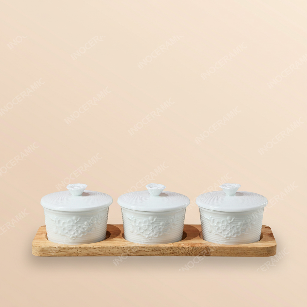 🎁 Bộ khay hũ đựng kẹo mứt hoa đào khắc nổi men trắng – Tinh hoa quà Tết gốm sứ Bát Tràng