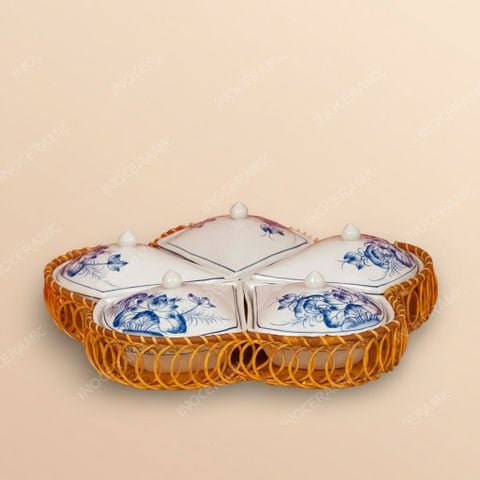 Bộ sản phẩm gồm 4 hũ đựng mứt đặt trên khay mây đan hình hoa khế độc đáo. Mỗi hũ được chế tác từ gốm sứ Bát Tràng cao cấp, nung ở nhiệt độ cao, đảm bảo độ bền chắc, an toàn trong quá trình sử dụng. Họa tiết sen xanh vẽ tay mềm mại, sắc nét giúp bộ khay mứt mang nét đẹp thanh khiết, trang nhã và rất phù hợp với không gian ngày Tết. Mỗi chi tiết đều được nghệ nhân hoàn thiện thủ công, tạo nên sản phẩm không chỉ dùng để đựng bánh kẹo, hạt khô mà còn có giá trị thẩm mỹ và trưng bày cao.