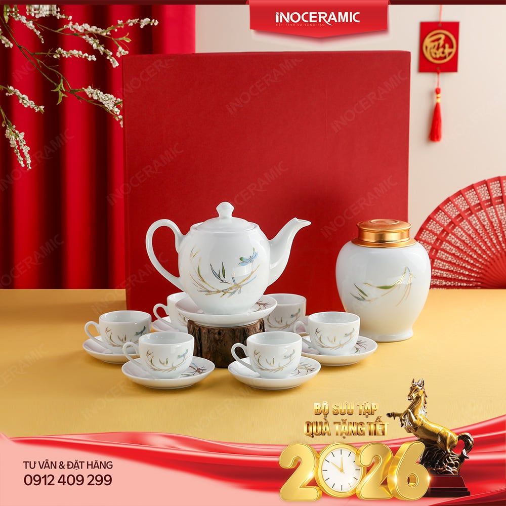 Trong không khí đón Tết rộn ràng, Bộ ấm trà Phong Trúc Vượng Niên là món quà tặng gốm sứ cao cấp mang thông điệp may mắn, thanh nhã và trường tồn. Sản phẩm được chế tác từ gốm sứ Bát Tràng chính hiệu, với thiết kế tinh tế gồm 1 ấm trà, 6 tách và 1 hũ đựng trà – tất cả được hòa quyện trong họa tiết trúc xanh và chuồn chuồn nhẹ bay, tượng trưng cho cát lành, kiên định và hưng thịnh quanh năm.