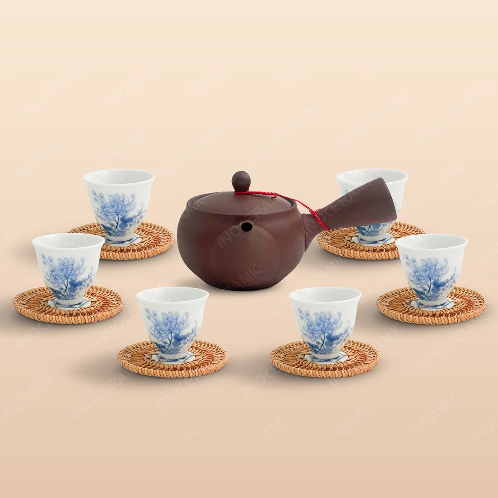 Bộ trà gồm ấm tay ngang bằng gốm đất nung kết hợp với 6 chén sứ cao kèm đĩa lót, tạo nên tổng thể sang trọng và hài hoà. Thiết kế tay ngang giúp người dùng cầm chắc tay, rót nhẹ và chính xác dòng nước trà mà không lo trào hay làm vỡ hương vị.