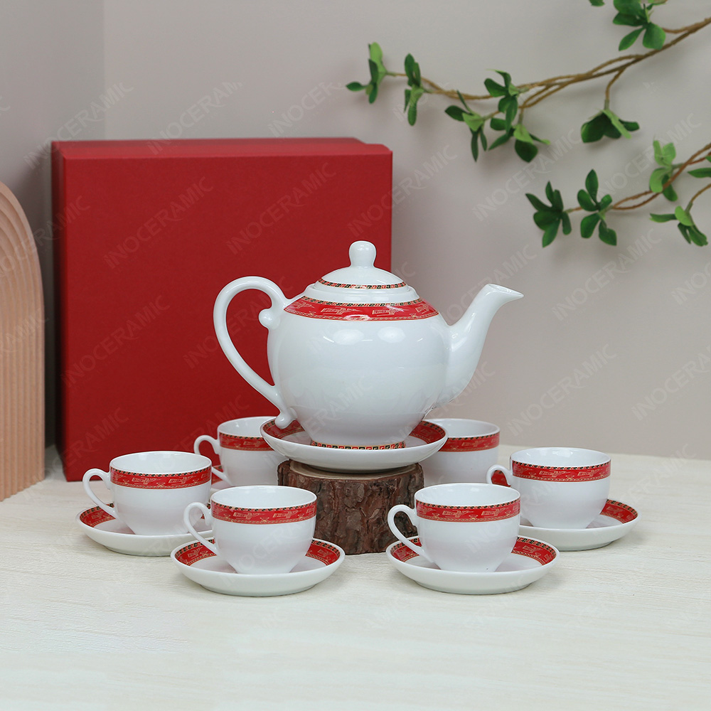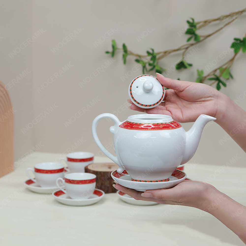 Sắc đỏ là biểu tượng của hỷ sự và năng lượng sống được sử dụng một cách khéo léo, không lấn át mà chỉ nhẹ nhàng tô điểm. Khi ánh sáng chiếu lên bề mặt men sứ, đường viền ấy như bừng sáng, làm tôn lên hình dáng thanh thoát của sản phẩm, đồng thời khơi gợi nét kiêu sa, hiện đại nhưng vẫn mang hồn cốt truyền thống.