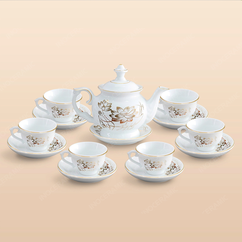 Men trắng cao cấp được nung ở nhiệt độ cao, giúp tạo lớp phủ mịn, sáng và bền màu theo thời gian. Đây là chất men lý tưởng cho các bộ trà sang trọng bởi khả năng làm nổi bật các chi tiết vẽ vàng và dễ dàng kết hợp với nhiều không gian nội thất.