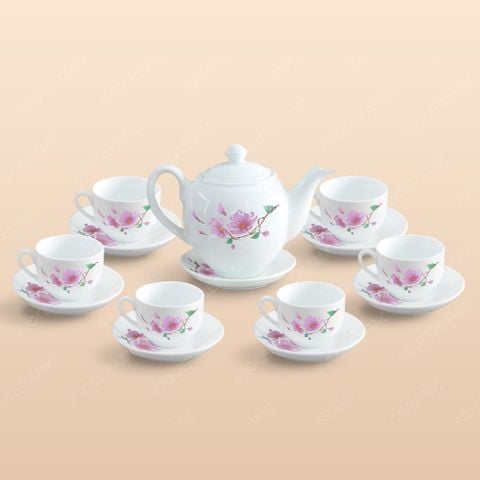 Bộ trà mang thiết kế dáng Minh Long trứ danh, thanh thoát, tinh xảo và cân đối trong từng đường nét. Họa tiết hoa đào hồng vẽ tay mang lại điểm nhấn mềm mại và sống động, tạo nên tổng thể vừa trang nhã, vừa giàu cảm xúc.