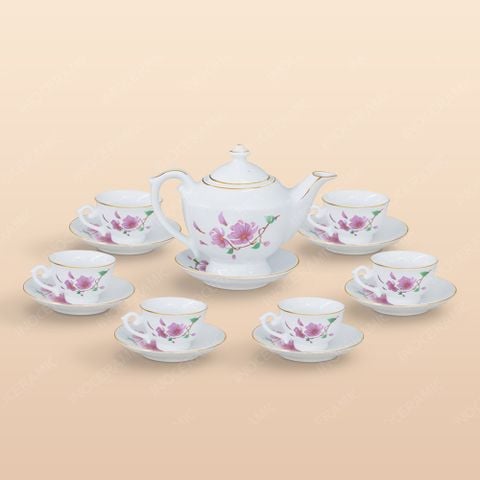 Bộ trà được tạo hình theo dáng Đèn thần với phần thân phình rộng, miệng thu nhỏ, tay cầm uốn mềm và vòi cong thanh thoát, vừa gợi nét cổ tích vừa mang cảm giác trang trọng. Điểm nhấn nằm ở những đóa đào hồng vẽ tay trên nền sứ trắng sáng, tái hiện sắc xuân rạng rỡ mà tinh tế. Những đường chỉ vàng kẻ quanh miệng ấm, miệng ly và đĩa lót làm tăng vẻ sang trọng cho toàn bộ bộ trà. Dù đặt trong phòng khách, góc trà đạo hay bàn tiếp khách công sở, bộ trà đều trở thành điểm nhấn đầy tinh tế và thi vị.