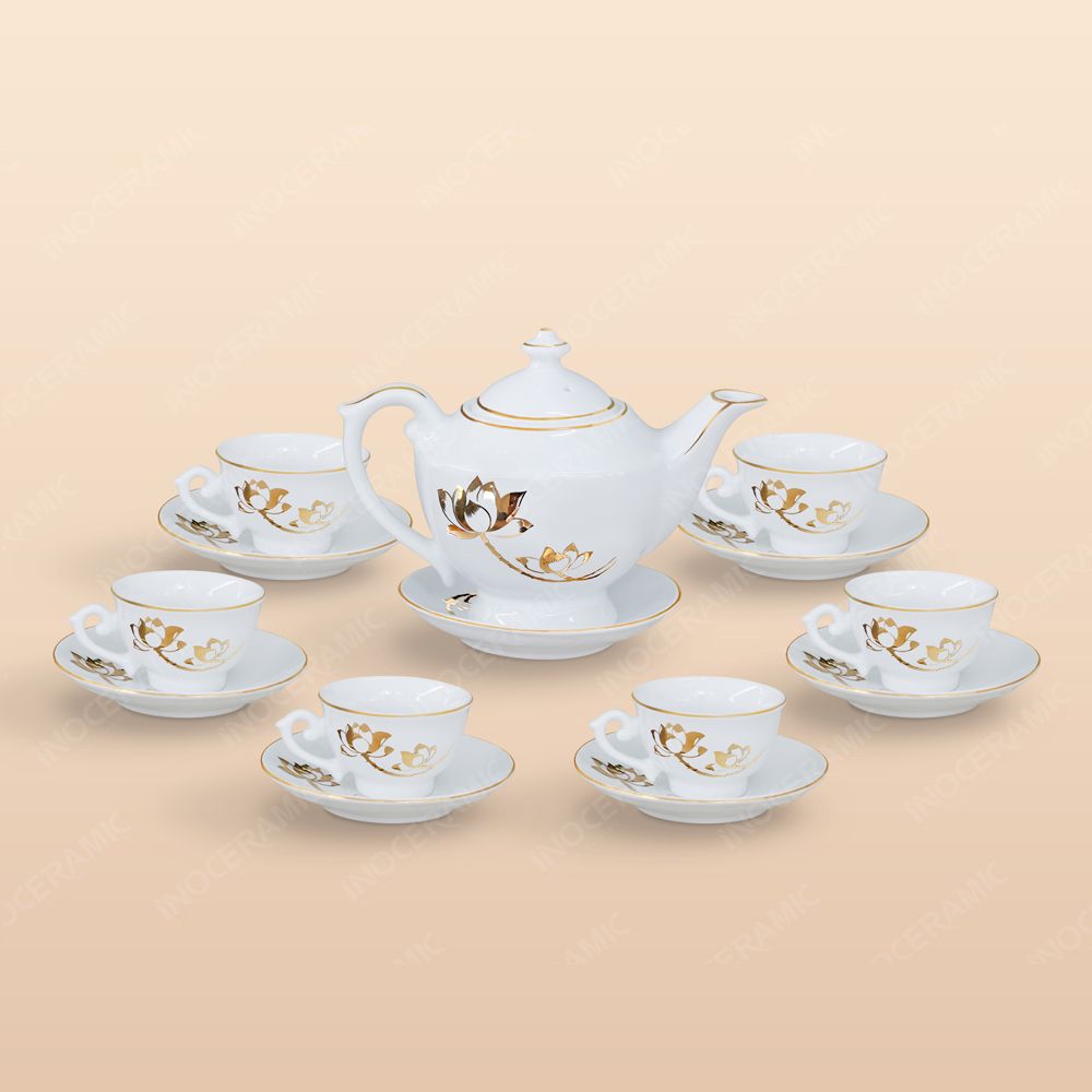 Khi kết hợp với sắc vàng, nó còn là biểu tượng của tài lộc và thịnh vượng. Mỗi bông sen vẽ trên ấm, tách như một lời chúc an lành và may mắn, đặc biệt phù hợp để làm quà tặng cao cấp dịp lễ Tết hoặc tri ân khách hàng.