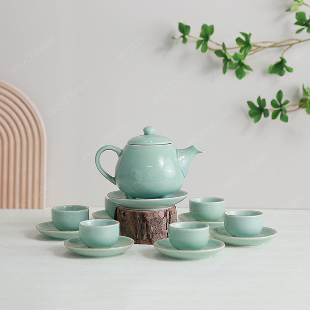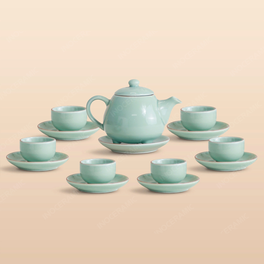 Kết hợp với lớp men lam ngọc tươi sáng, sản phẩm có độ bóng mịn đặc trưng, tạo hiệu ứng ánh sáng tự nhiên, mang lại cảm giác sang trọng khi sử dụng. Men ngọc còn có đặc tính chống bám bẩn, giữ màu tốt, đảm bảo độ bền lâu dài cho bộ ấm trà, dù sử dụng hàng ngày.