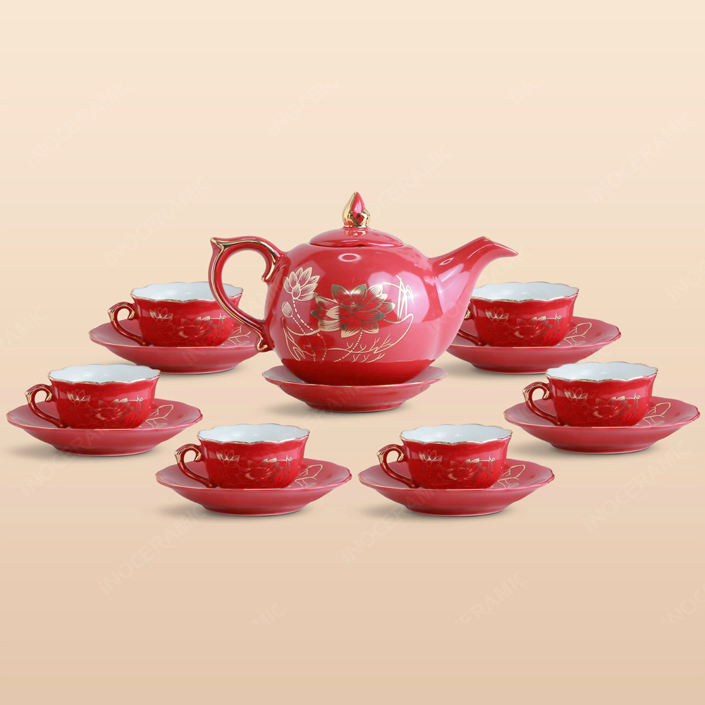 Bộ ấm trà Mẫu Đơn men đỏ sen vàng vẽ vàng là một tác phẩm gốm sứ cao cấp, mang trong mình sự hòa quyện tuyệt vời giữa vẻ đẹp của nghệ thuật truyền thống và phong thủy. Với chất liệu sứ cao cấp và lớp men đỏ sang trọng, bộ trà này không chỉ là vật dụng dùng trong các buổi trà đạo mà còn là món đồ trang trí đẳng cấp, mang lại sự thịnh vượng và may mắn cho gia chủ. Màu men đỏ rực rỡ, tượng trưng cho tài lộc, may mắn và sự sung túc, trong khi họa tiết sen vàng lại mang đến vẻ đẹp thanh thoát, tinh khiết và đầy sức sống.