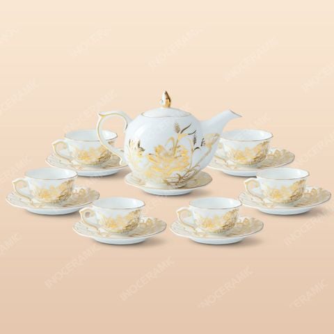 Bộ trà Mẫu Đơn Sen đắp nổi vẽ tay mang họa tiết vàng sang trọng, đường nét mềm mại và tinh xảo trên nền sứ trắng cao cấp. Ấm trà và 6 tách kèm đĩa được chế tác tỉ mỉ, toát lên vẻ quý phái và nghệ thuật, là lựa chọn quà tặng doanh nghiệp đẳng cấp và trang nhã.