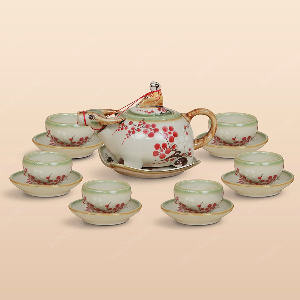 Tên sản phẩm: Bộ ấm trà Mục đồng cưỡi trâu men ngọc vẽ đào đông in logo