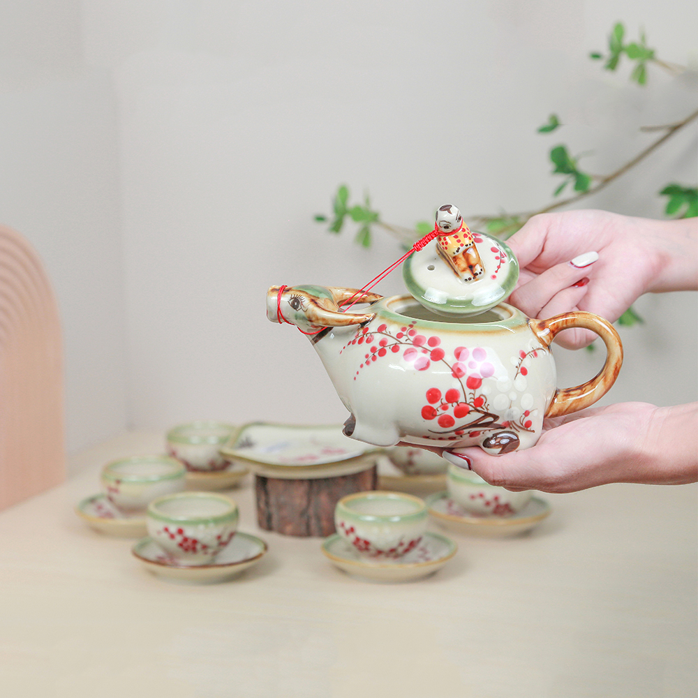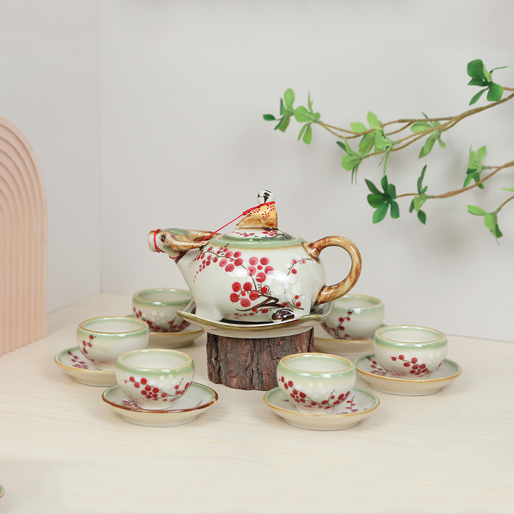 Bộ trà gồm đầy đủ các món: ấm, tách, đĩa lót được thiết kế hài hòa, gọn gàng và dễ sử dụng trong các buổi tiếp khách, họp mặt thân mật hoặc trang trí không gian trà đạo phong cách đồng quê.