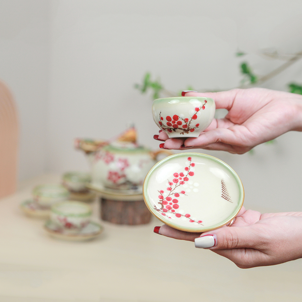 Kết hợp cùng đó là họa tiết hoa đào đông, loài hoa mang vẻ đẹp thanh khiết, được vẽ thủ công trên thân ấm và tách trà. Mỗi nhành đào, mỗi cánh hoa đều mang sự khéo léo, mềm mại và tinh tế làm nổi bật trên nền men xanh ngọc như một bức tranh đồng quê thu nhỏ. Những họa tiết này không chỉ thể hiện tay nghề cao của nghệ nhân Bát Tràng mà còn gửi gắm tình yêu quê hương, ký ức tuổi thơ và sự trân trọng những giá trị văn hoá xưa.