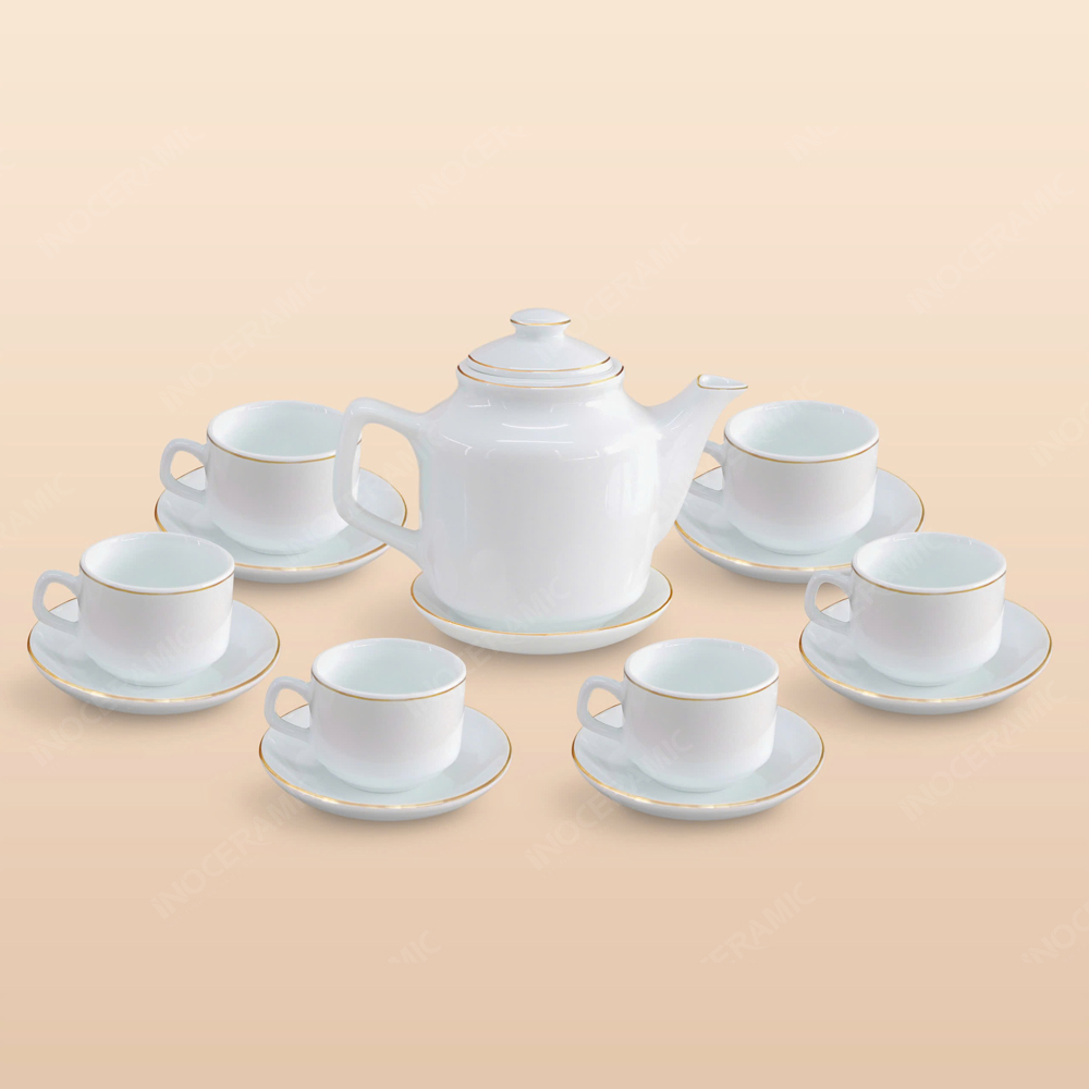 Điểm nhấn tinh tế nằm ở đường chỉ vàng chạy viền quanh miệng ấm, miệng tách và viền đĩa lót. Chỉ một đường mảnh đơn, nhưng lại khiến bộ trà trở nên sang trọng và có chiều sâu thị giác. Trong ngôn ngữ thiết kế gốm sứ, chỉ vàng tượng trưng cho sự quý phái, trang trọng – thường xuất hiện trong bộ ấm trà cao cấp dùng làm quà tặng cao cấp in logo cho doanh nghiệp hoặc dịp lễ trọng đại.