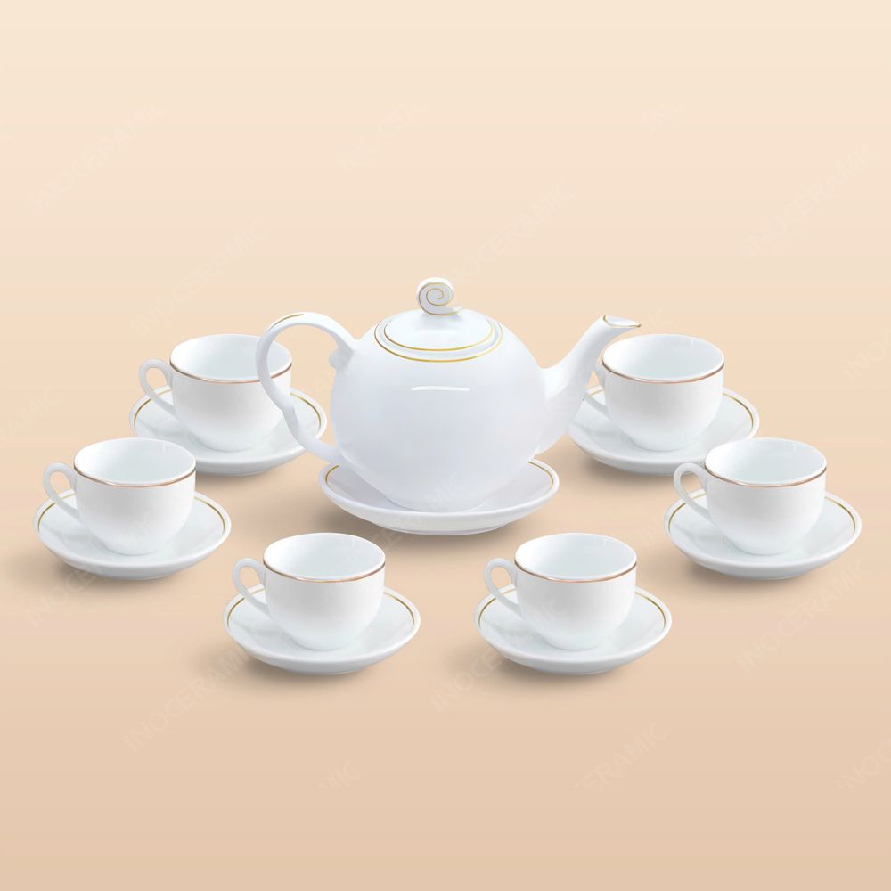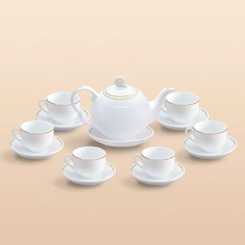 Với tông trắng thanh khiết, hình khối cân đối và đường chỉ vàng chạy dọc nắp, quai và miệng ấm, bộ trà này vừa mang vẻ đẹp hiện đại, vừa gợi lên sự thanh thoát đặc trưng của dòng sứ cao cấp.