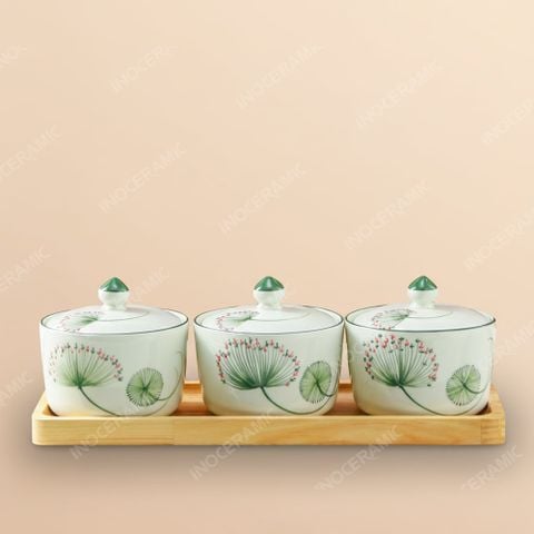 Họa tiết bồ công anh được thể hiện bằng các nét vẽ mảnh, nhẹ nhàng, tạo cảm giác thanh thoát, tượng trưng cho sự lan tỏa điều lành và khởi đầu mới may mắn. Bộ bộ hũ mứt được phủ men ngà, viền xanh nổi bật ở nắp và miệng hũ mang lại sự đồng bộ và sang trọng.