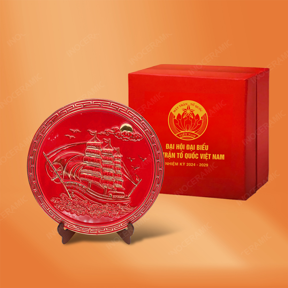 Đĩa trưng bày Thuận Buồm men màu kẻ vàng quà tặng Đại hội Mặt Trận Tổ Quốc