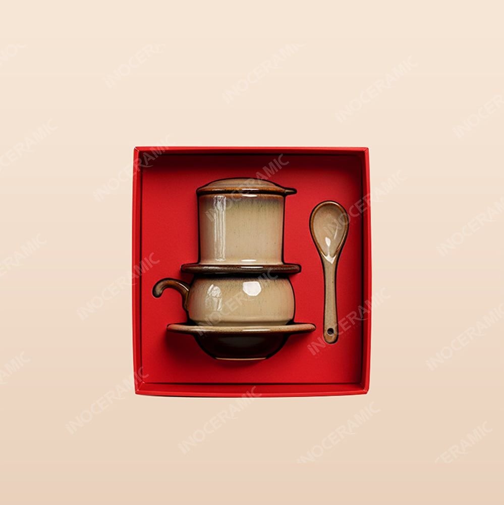 Điểm nổi bật của Giftset quà tặng phin sứ kèm thìa Hoài Mộc nằm ở bảng màu men nâu be trầm ấm, gợi cảm giác gần gũi, thư thái và có chiều sâu. Phong cách này rất phù hợp với những doanh nghiệp đang tìm một mẫu quà tặng gốm sứ cao cấp vừa có cá tính riêng vừa dễ ứng dụng trong nhiều bối cảnh tặng quà.