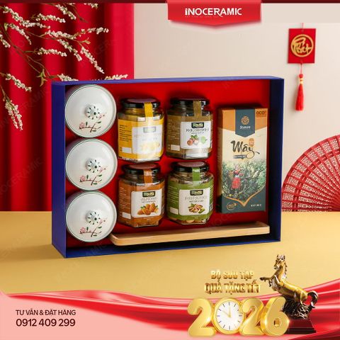 Mỗi chi tiết trong hộp quà đều được thiết kế cẩn trọng: từ họa tiết hoa đào vẽ tay trên từng hũ gốm, đến sắc xanh – đỏ chủ đạo tượng trưng cho may mắn và tài lộc, tất cả hòa quyện tạo nên một món quà biếu Tết cao cấp đậm đà hồn Việt.