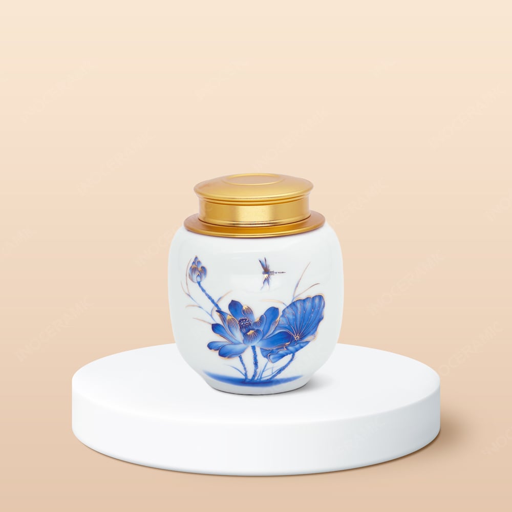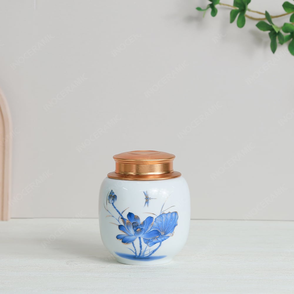- Tên sản phẩm: Hũ đựng trà Sen xanh cobalt men trắng