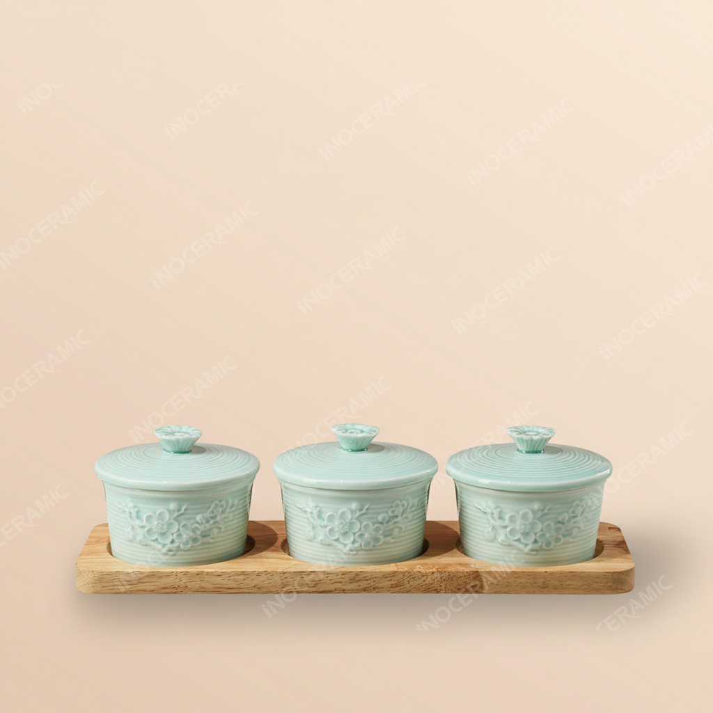 Bộ hũ mứt không chỉ dùng để đựng mứt Tết mà còn rất phù hợp làm hũ đựng bánh kẹo, hũ đựng hạt, hũ đựng ô mai hay khay đựng bánh kẹo tiếp khách quanh năm. Khay gỗ đi kèm được gia công chắc chắn, màu gỗ tự nhiên ấm áp giúp tôn lên sắc men ngọc thanh nhã, tạo nên tổng thể hài hòa, sang trọng và gần gũi.