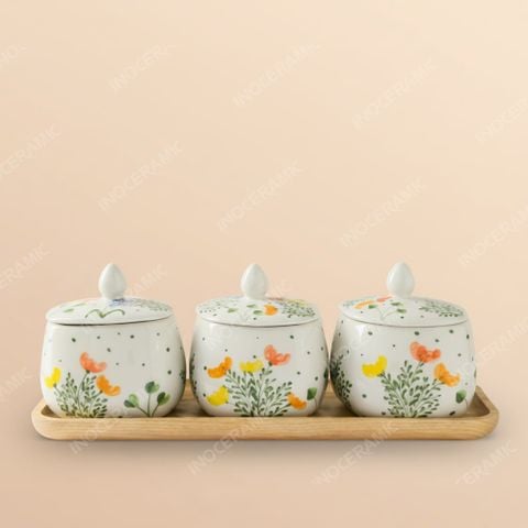 🎁 Khay 3 hũ mứt vuông méo men kem Sắc Xuân – Quà Tết tinh tế đậm chất thủ công Bát Tràng