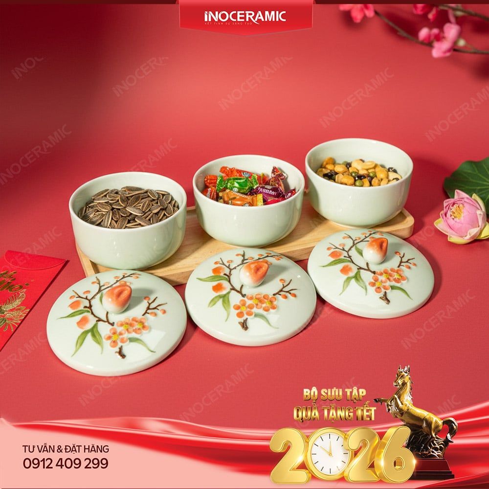 Điểm nổi bật của bộ hũ đựng mứt men ngọc này là họa tiết đào chín được đắp nổi hoàn toàn bằng tay, tạo hiệu ứng nổi 3D mềm mại, sắc sảo và có chiều sâu. Hình ảnh đào chín tượng trưng cho sự sum vầy, may mắn, phú quý nên cực kỳ phù hợp làm quà Tết doanh nghiệp. Sắc men ngọc xanh trong dịu nhẹ – signature của gốm Bát Tràng – mang đến vẻ đẹp sang trọng nhưng vẫn gần gũi truyền thống. Bộ sản phẩm gồm ba hũ sứ dày dặn, nắp sứ hoa đào đắp nổi, kết hợp cùng khay gỗ tự nhiên giúp tổng thể hài hòa, sang trọng và có giá trị trưng bày cao.