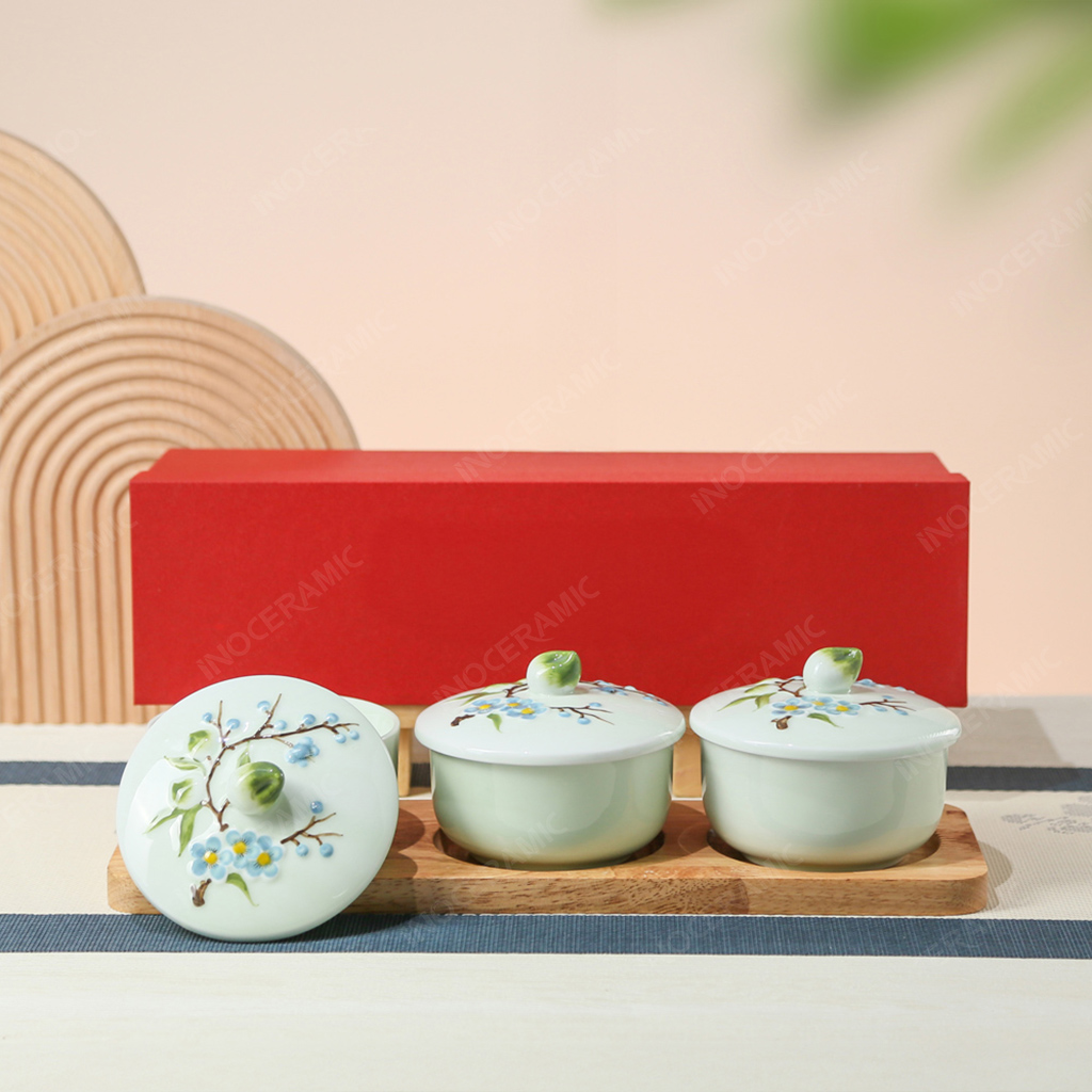 Khay hũ đựng mứt Thanh Đào Cát Tường men ngọc gốm sứ Bát Tràng là một sản phẩm quà tặng Tết mang vẻ đẹp độc đáo, thanh nhã và giàu giá trị biểu tượng. Bộ sản phẩm gồm ba hũ đựng mứt được đặt trên khay gỗ tự nhiên, phù hợp bày trên bàn tiếp khách, bàn trà hoặc đóng gói thành set quà Tết, hộp quà Tết cao cấp gửi tặng khách hàng, đối tác, cơ quan và tổ chức dịp năm mới. Sự kết hợp giữa sắc men ngọc xanh dịu và họa tiết đào xanh non tạo nên phong cách sang trọng, khác biệt, phù hợp với những doanh nghiệp muốn tìm một món quà mang tính nhận diện và giá trị văn hóa cao.