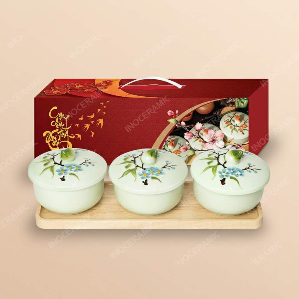 Bộ sản phẩm được chế tác trực tiếp từ xưởng gốm sứ Bát Tràng, trải qua quy trình kỹ lưỡng từ tạo hình, khắc nổi, vẽ màu đến nung nhiệt cao đảm bảo độ bền và độ an toàn tuyệt đối khi đựng thực phẩm. Khay gỗ đi kèm được gia công kỹ thuật chống cong vênh, đảm bảo tính thẩm mỹ và độ bền lâu. Vì vậy, set hũ mứt đáp ứng đầy đủ tiêu chí của các hộp quà Tết cao cấp dành cho doanh nghiệp.