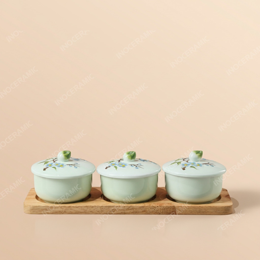 Men ngọc là dòng men được đánh giá cao trong nghệ thuật gốm sứ Bát Tràng nhờ sắc men trong, mịn và phản chiếu ánh sáng đẹp tinh tế. Khi kết hợp cùng tông xanh nhẹ nhàng của họa tiết đào, bộ hũ mứt trở thành sản phẩm trang trí lý tưởng trong không gian tiếp khách ngày Tết. Ngoài việc dùng để đựng mứt, sản phẩm còn thích hợp sử dụng như khay mứt, hũ đựng bánh kẹo, khay đựng bánh kẹo, hũ đựng hạt, giúp nâng tầm thẩm mỹ không gian sống và tạo điểm nhấn cho bàn trà gia đình.